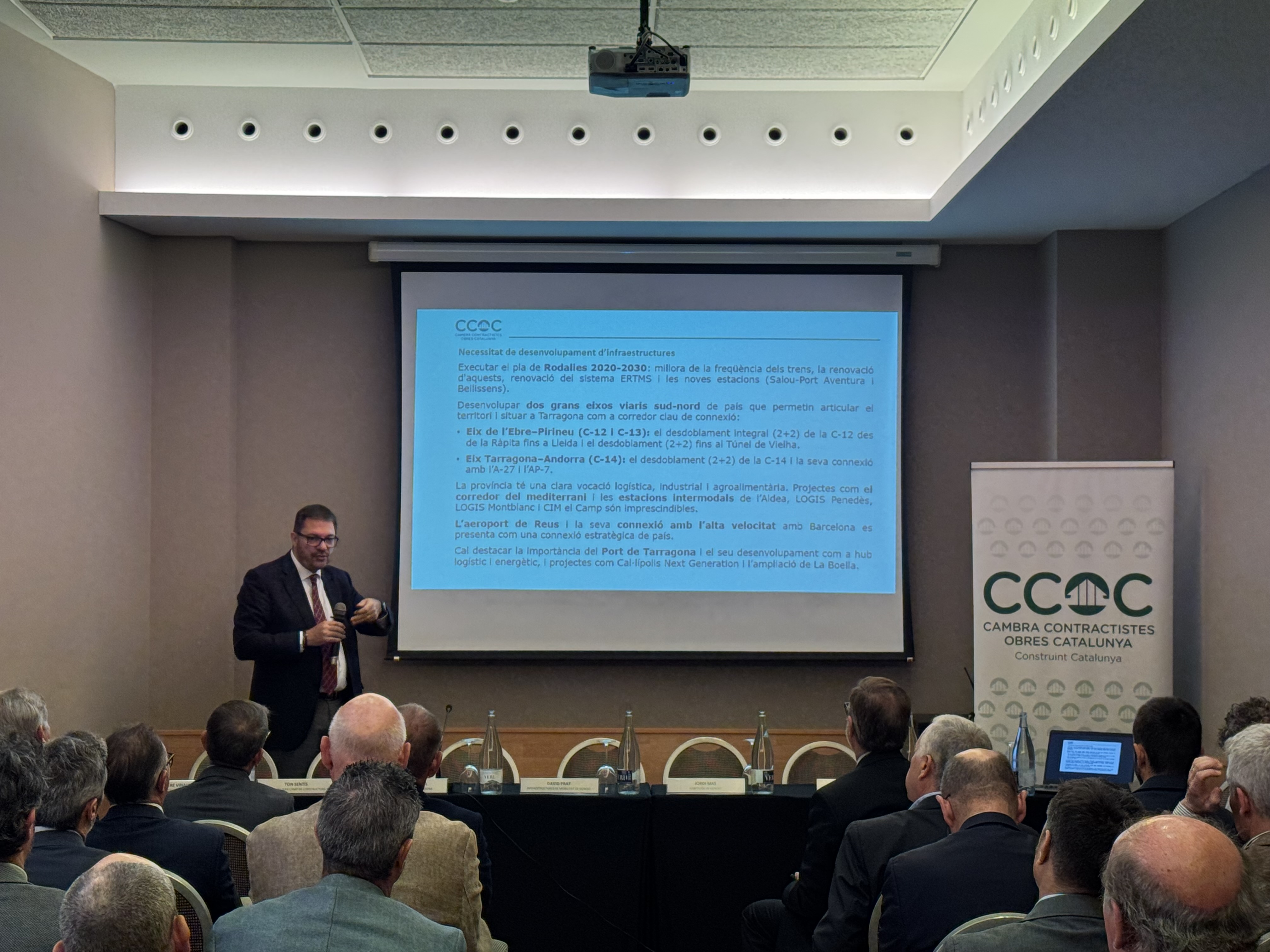 El president de la CCOC, Lluís Moreno, va exposar el CAT100 Tarragona, el catàleg que identifica 22 infraestructures prioritàries per reforçar la competitivitat i sostenibilitat del territori. Les actuacions inclouen millores en mobilitat ferroviària i viària, ampliació del corredor mediterrani de mercaderies, millora de la connectivitat de l’aeroport de Reus, reforç de l’autoabastament hídric i desenvolupament de grans plataformes logístiques.