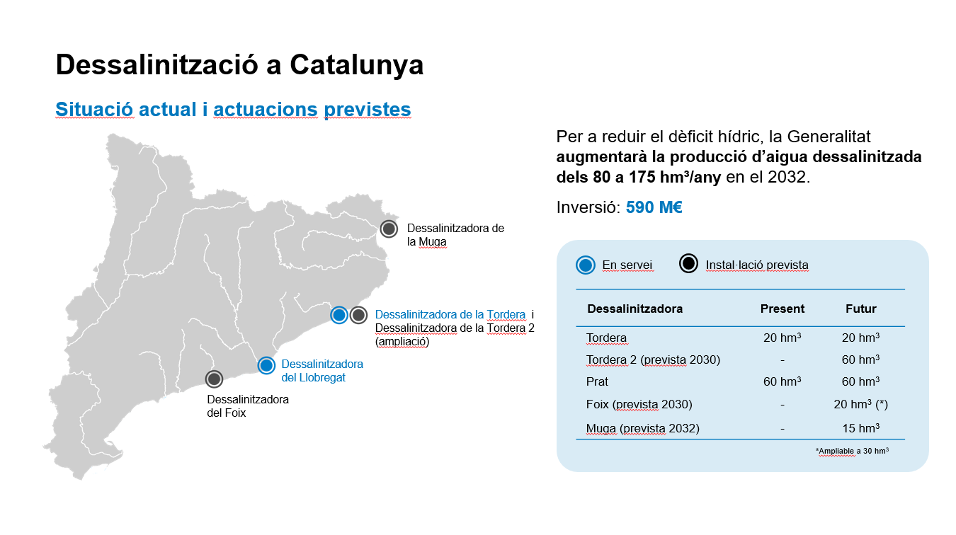 En l’horitzó 2032, la Generalitat preveu augmentar la producció d’aigua dessalinitzada dels 80 als 175 hm³ anuals, amb una inversió estimada de 590 milions d’euros. Aquest increment permetrà reduir la dependència de la pluviometria i avançar cap a un model estructuralment més resilient.