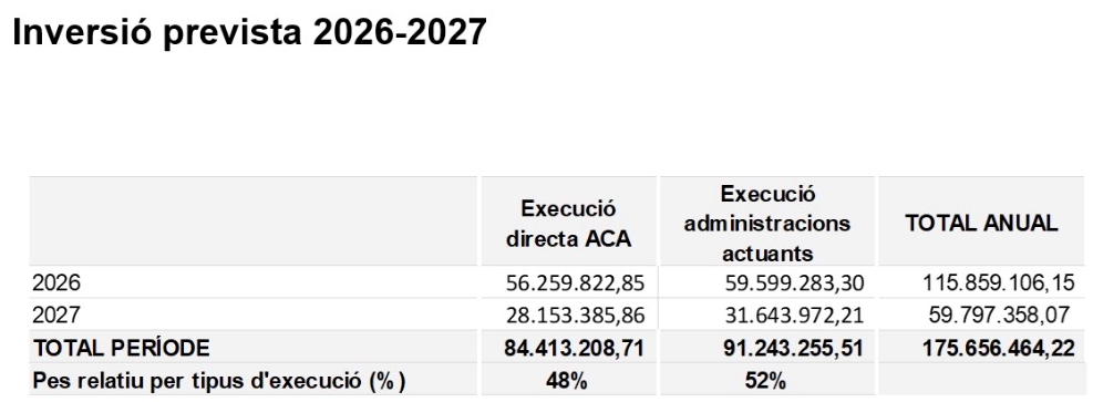 Durant la seva conferència, Armenter ha detallat que l’ACA preveu mobilitzar 175,6 milions d’euros en el període 2026-2027 en infraestructures del cicle de l’aigua, distribuïts entre execució directa de l’Agència i actuacions a través d’altres administracions, amb l’objectiu d’incrementar la garantia hídrica.