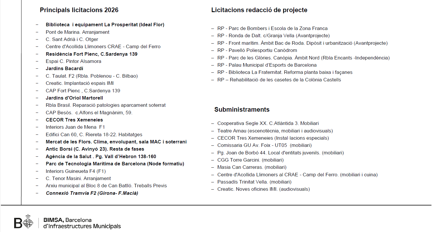 En relació amb les licitacions previstes, s’han avançat actuacions en àmbits com equipaments educatius i sanitaris, urbanització de carrers, espai públic i projectes estratègics com la Ronda de Dalt o el front marítim, que generaran noves oportunitats per a les empreses del sector.